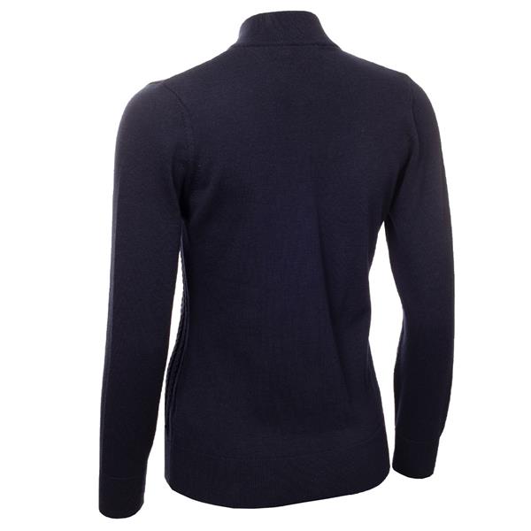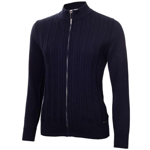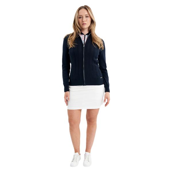 Don’t let the inclement weather interfere with your game – beat the chill with the Olena Cable Cardigan from Green Lamb. A striking full zip style with tonal cable knit pattern on the front panels. Snug high ribbed collar, hem and cuffs help retain warmth. Silver coil front zip finished with a Green Lamb branded zip pull.