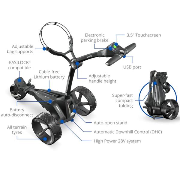 Integrated into the luxury M-TECH, the proprietary Motocaddy DHC technology automatically regulates the trolley’s speed while moving down hills, helping golfers stay in complete hands-free control. This combines with all-terrain tyres and an electronic parking brake to hold the trolley in place - uphill or downhill - while you play your shot. DHC technology is considered an essential feature for golfers across the globe, upgrading trolley performance and enhancing enjoyment.