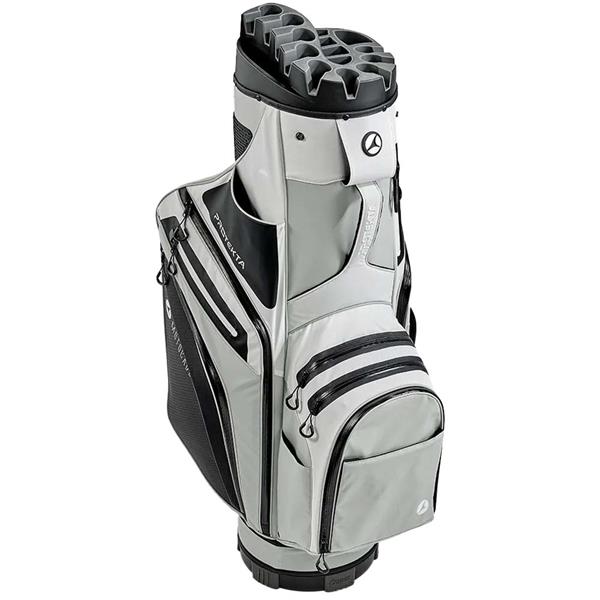 The 14-way noise-reducing organiser top with full-length dividers keeps clubs securely separated and rattle-free. Stay organised with ten spacious pockets - including a velour-lined valuables pocket and a large insulated cooler compartment - plus an external beverage pouch for on-the-go refreshment.
