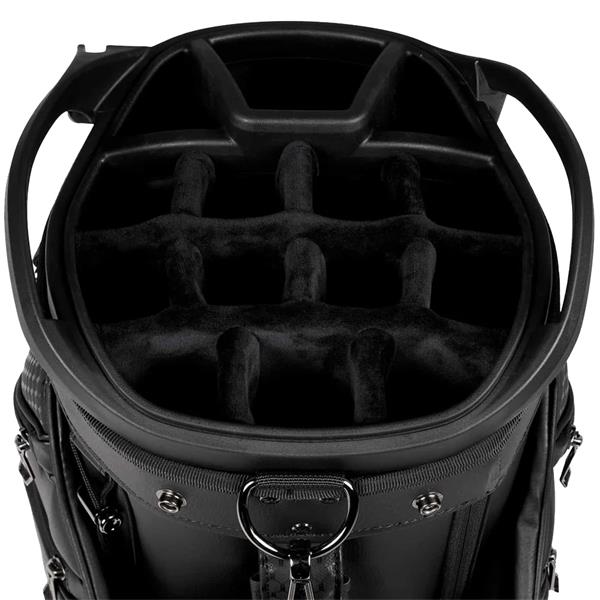 Elevate your next round with the versatile style of our NextGen Deluxe Cart Bag. Made from a leather-like polyurethane that is both elegant and durable, this sharp bag is available in all-black or all-white and features a velour-wrapped 14-way top to keep your clubs organized and protected. A variety of pockets keep your essentials organized, including a velour-lined valuables pocket with combination lock and an insulated water bottle pocket.