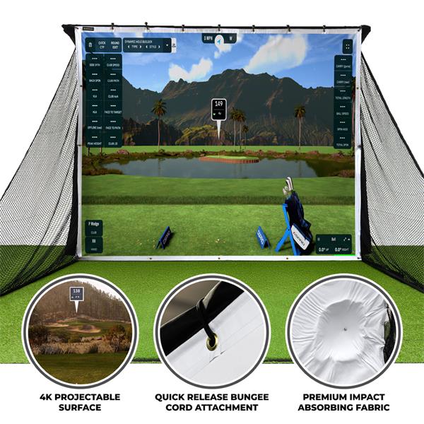 Perfect for home golfers the SimSpace Elite Impact Screen, is designed specifically for light home use. Crafted from a tight-knit polyester blend, it ensures excellent 4K image quality and durability. Ideal for those starting their indoor golf journey.